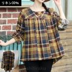 春 夏 秋 レディース トップス チェック ブラウス 長袖 フレアーブラウス プルオーバー ゆったり ビック シャツ 綿 麻 コットン リネン 袖切替 ギャザー オーバ