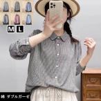 ダブルガーゼ シャツ 綿 レディース ブラウス ギンガム 千鳥 ストライプ 2重ガーゼ コットン 長袖 シェルボタン 薄手 通気性 黒 ブラック グリーン チェック グ