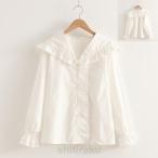 レディース ブラウス フリル衿 大きな衿 前たてフリル 無地 コットン 綿 シャツ 綿ポプリン 長袖 シャーリング袖 オフホワイト お出かけ 通勤 通学 春 夏秋