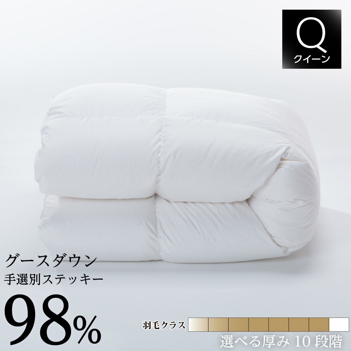 羽毛布団 クイーンサイズ 210×210cm ポーランド産 スーパープレミアム ステッキー ホワイトグース ダウン98% 480dp 高級 掛け布団 ドイツ製 超軽量・超高通気生地 綿100% 収納袋付 日本製 10年保証付き 羽毛肌布団 合掛け 中厚 普通厚 厚手2層 10種類の厚みから選択可