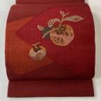 袋帯 秀品 紬地 柿 刺繍 金糸 えんじ色 お太鼓柄 正絹 中古