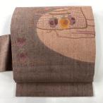 美品 名古屋帯 秀品 紬地 干し柿 籠 相良刺繍 汕頭刺繍 焦茶色 正絹 中古