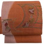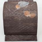 袋帯 秀品 夏帯 柿 霞 箔 金糸 焦茶色 お太鼓柄 正絹 中古