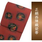 袋帯 お仕立て付 赤地 洋ナシと栗の丸紋格子柄 紹 古今絵巻【HZ】