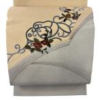 袋帯 秀品 椿 唐草 刺繍 金糸 ベージュ お太鼓柄 正絹 中古