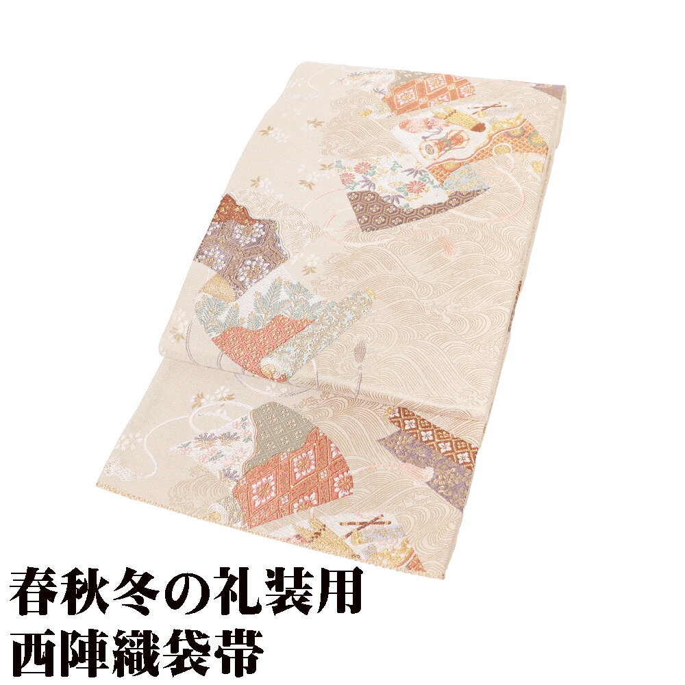 \ 20%offクーポン / 礼装用 袋帯 正絹 ベージュ 金箔 巻物 笙 鼓 横笛 松竹梅 花菱 亀甲 Lサイズ F8219 美品 レディース フォーマル 30代 40代 50代 送料無料