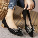 パンプス ポインテッドトゥ 太めヒール ラメ入り キラキラ リボン付き おしゃれ 可愛い 大人 カジュアル 歩きやすい 履きやすい 美脚 結婚式 通勤 オフィス 黒