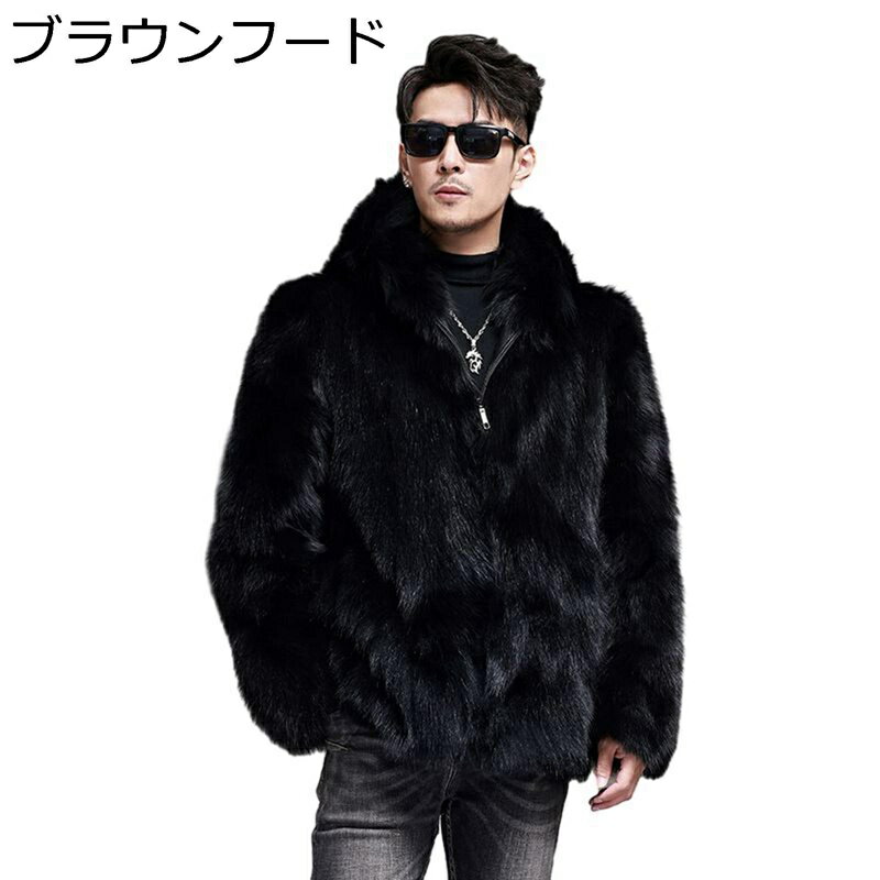 毛皮コート メンズ フェイクファージャケット ブラック L-5XL フード付き 立ち襟 もこもこ モフモフ フルジップジャケット ボア 防寒服 冬服 秋用 裏起毛 もこもこ 暖かい 厚手 アウトドア カジュアル 通勤