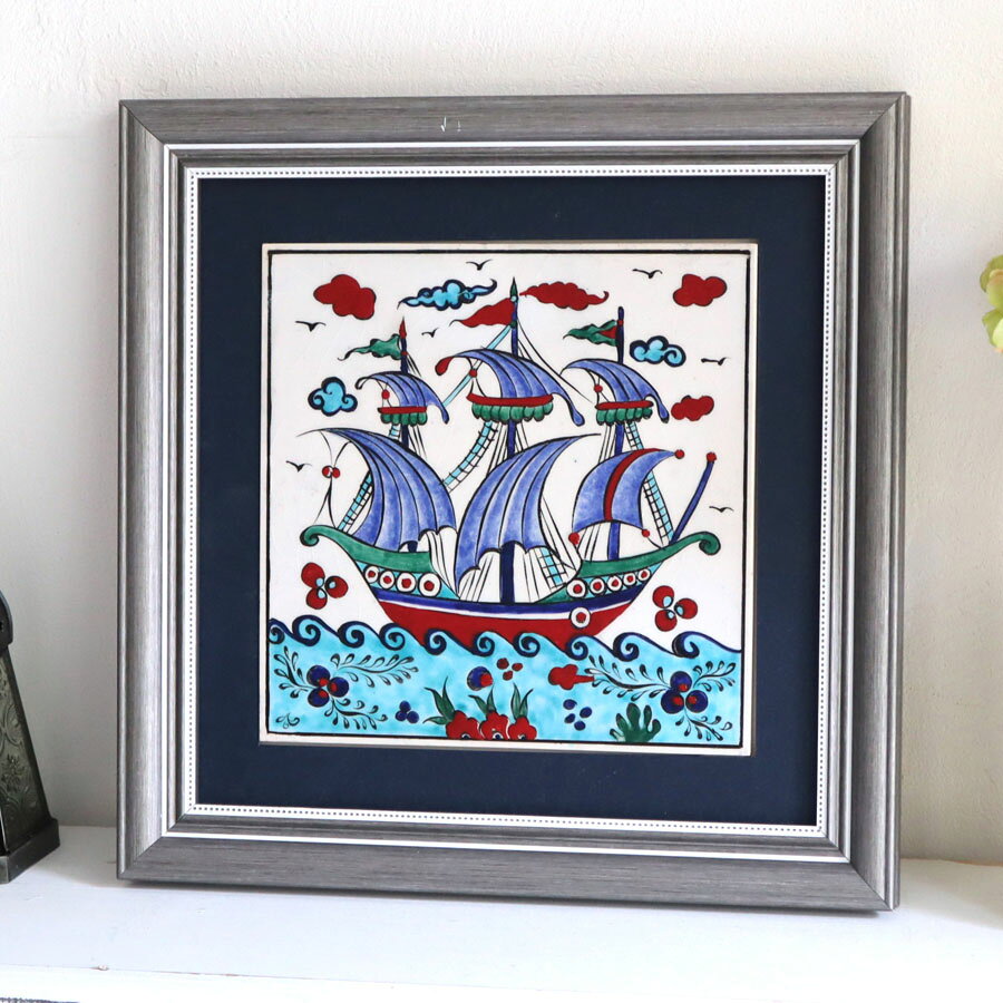 【15%OFFクーポン対象】トルコ陶器 手書きタイル 1枚額 H31×W31×D2.5cm チャナッカレ・トロイの船 Turkish Hand Paint Tile
