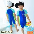 水着 オールインワン 2点セット キッズ 子供用 男の子 水泳帽 ラッシュガード スイムウェア 半袖 ショート丈 イラスト フロントファスナー ブルー