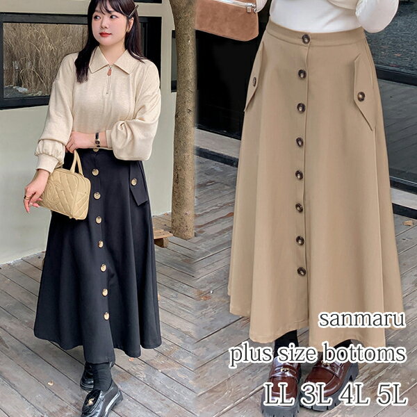 大きいサイズ レディース Aラインスカート ツイル生地 フロントセンターに水牛ボタンデザイン ボタン付きフラップ サイドポケット ウエストフロントフラット ウエストバックゴム仕様 ロング丈 ブラック ブラウン LL 3L 4L 5L 秋【予約】