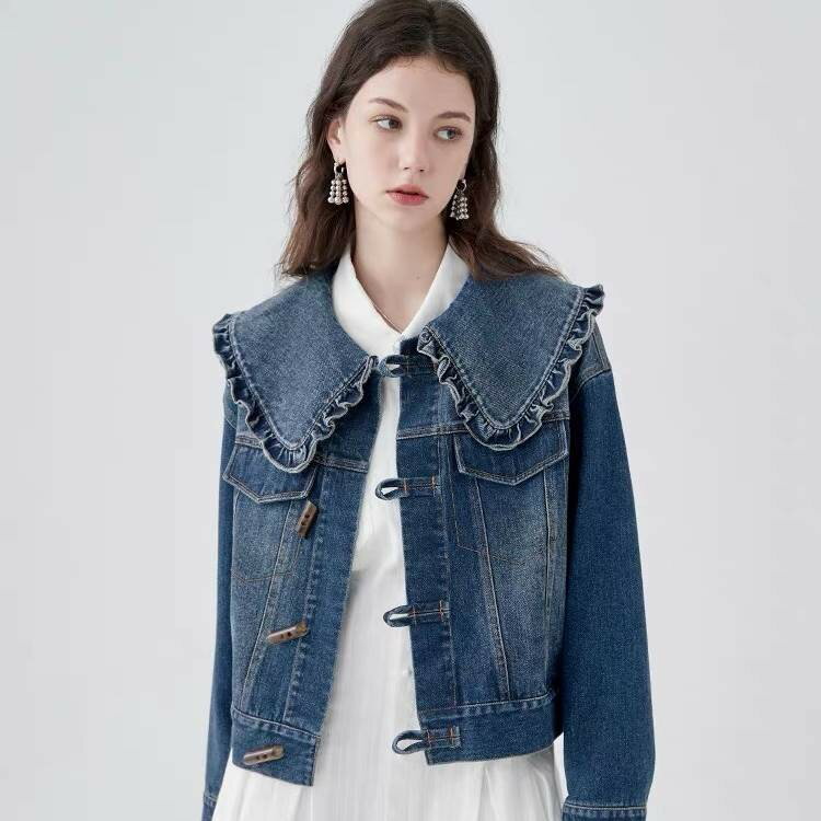 【早い者勝ち★先着10名:600円Offクーポン】アウター レディース ジャケット ジャンパー Gジャン ブルゾン 袖あり 長袖 ビッグカラー フリル 襟付き ボタン 水牛ボタン バッファロー風 シンプル きれいめ かわいい ブルーデニム