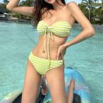 ビキニ バンドゥ ギンガムチェック 白 黒 ブラック ホワイト 編上げ 体型カバー バンドゥビキニ 小胸 バスト 盛れる オフショルダー セパレート 重ね着 セクシー 水着 レディース タンキニ チューブトップ M L 海外 かわいい 可愛い モノトーン トレンド 紐 送料無料 [J](T)