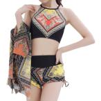 タンキニ 3点 セット パレオ 付き レディース 水着 エスニック 柄 ホルターネック 体型 カバー 防水 MDM(イエロー/オレンジ, M)