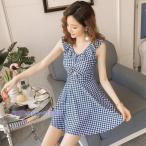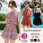 水着レディース 体型カバー 水着 ワンピース型 ショートパンツサロペット水着 チェック柄 フレア 水着 韓国風 40代 大きいサイズ 可愛い スイムウェア ママ水着