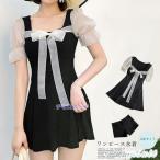 夏 水着 レディース ワンピース オールインワン 体型カバー リボン 長袖 おしゃれ かわいい 黒 白 スクエアネック ティアード レース