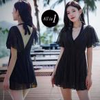 夏 水着 レディース ワンピース オールインワン 体型カバー 半袖 黒 ラメ 透け感 シースルー おしゃれ かわいい 大人 フレア Vネック 背中開き