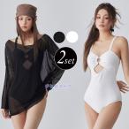 夏 水着 ワンピース オールインワン 体型カバー トップス 長袖 レディース 2点セット ギャル シースルートップス