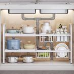 シンク下収納ラック 洗面台下収納 キッチンシンク下収納ラック 収納バスケット付 2段 伸縮 組み立て簡単 省スペース 伸縮棚 横幅調整可能