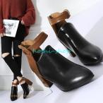 大きいサイズショートブーツ レディース チャンキーヒール ポインテッドトゥ 太ヒール 合皮ブーツ バックファスナー ブーツ 黒ブーツ バイカラー ミドルヒール