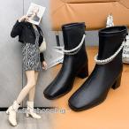 大きいサイズショートブーツ レディース スクエアトゥ チャンキーヒール バックファスナー 合皮ブーツ 黒ブーツ ミドルヒール ブーツ シューズ フェイクパール