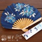 [扇袋セット] 扇子 染骨 あじさい(紺 1027s) 化粧箱 シェル型 花柄 水彩 青 ネイビー 竹 布 綿 和装 夏 着物 浴衣 洋服 レディース 婦人用 女性 (ma505)