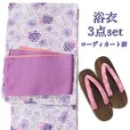 アウトレット 浴衣 レディース セット 紫 パープル ピンク 薔薇 バラ キュート 浴衣 帯 下駄 婦人 女性用 コーデ済 和服 和装 ゆかた 3点セット 訳アリ