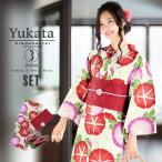 浴衣 レディース セット (浴衣+帯+下駄) 「朝顔 赤×紫+半幅帯レッド」(メール便不可)
