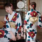浴衣 5点セット レディース(ゆかた・しわ兵児帯・下駄・着付け本・腰ひも)大人 白 生成り 椿 フェミニン 可愛い レトロ【古典大正ロマン】【夏のオレンジユーム】
