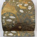 美品 袋帯 秀品 松皮取漆器盆 草花 蝶 金糸 箔 山吹茶色 六通 正絹 中古