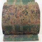 美品 袋帯 秀品 本漆器 幾何学 箔 緑 六通 正絹 中古