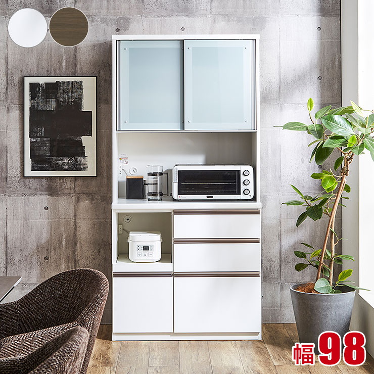 ★10%OFF★ 食器棚 完成品 大川家具 レンジ台 おしゃれ スリム 省スペース レンジボード レンジ ラック レンジラック コンセント 炊飯器 引き出し スライド ミレ ホワイト ダークブラウン 鏡面 白 木目 キッチン収納 幅98 設置無料 日本製