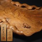 慶應◆昭和9年大阪府工芸展覧会入選作品【中川素明(鶴之助)】作 木彫清葉香盆(蓮葉に蛙 煎茶盆) 共箱 香道具 煎茶道具葉盆
