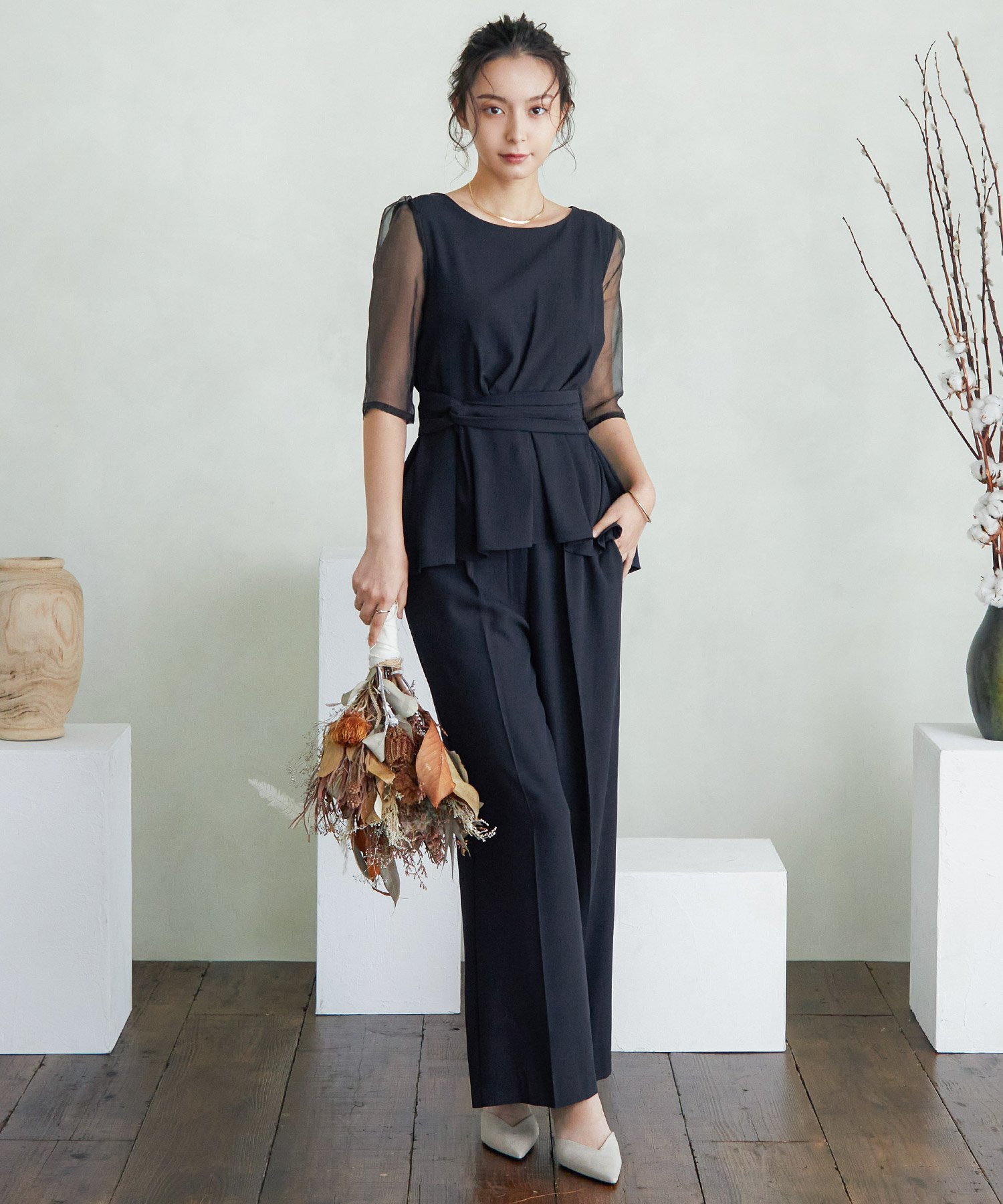 【SALE/39%OFF】niana ギャザートップスワイドパンツセットアップ パンツドレス 結婚式 成人式 二次会 ビーフラット ワンピース・ドレス ドレス ネイビー ブラック カーキグリーン【送料無料】