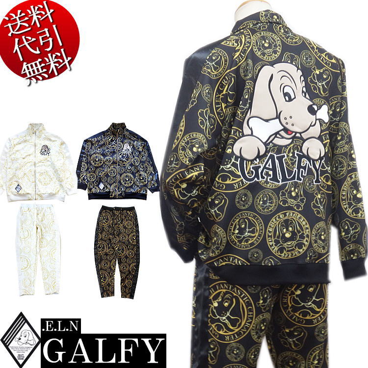 秋冬物新作 GALFY.E.L.Nガルフィー【送料無料】成金チンピラ 人気キャラアップリケ刺繍 ロゴ 総柄 ややスリム ジャージ サイドライン ZIPファスナー 長袖長パンツ 上下セットアップスーツ SETUP 白/黒 L中型犬/XL大型犬【smtb-k】【ky】父の日【YDKG-k】メンズ【RCP】153071