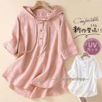 半袖パーカー レディース パーカー 五分袖 リネン風 フード付き ゆったり UVカット Tシャツ カジュアル カットソー トップス 夏服 おしゃれ