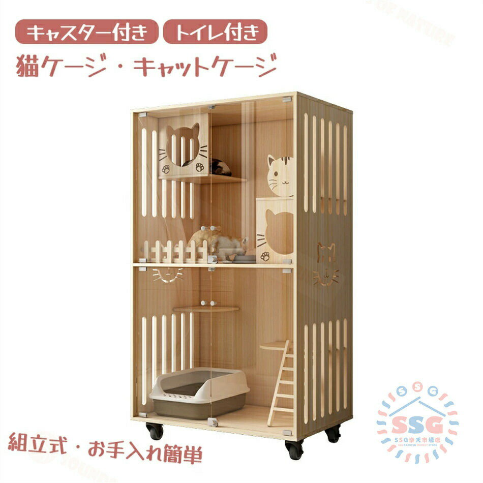 猫 ケージ キャットケージ 無垢材 ケージ 猫ケージ 木製 留守番 保護 多頭飼い 車輪付き 猫 ハウス ねこケージ ネコケージ キャスター付き コンパクト 大型 広い ステップ 上下運動 お手入れ簡単 組立必要 室内飼い 脱走防止