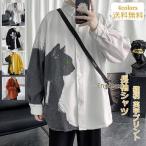 長袖シャツ メンズ シャツアウター 猫柄 英字プリント 春秋 トップス カジュアル ポケット付き かっこいい 男性用 きれいめ おしゃれ