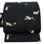 美品 名古屋帯 逸品 猫 桜 金糸 刺繍 黒 正絹 中古