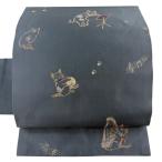 名古屋帯 逸品 銀座もとじ 猫の合奏 足跡 銀糸 箔 灰色 正絹 中古