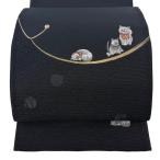 美品 袋帯 逸品 猫 三日月 銀糸 金彩 黒 お太鼓柄 正絹 中古