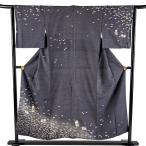 訪問着 身丈152cm 裄丈64cm M 袷 紬地 やまと 猫 花びら 金彩 灰紫 正絹 逸品 中古