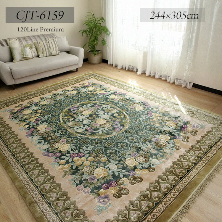シルク緞通ラグ《CJT-R6159 244×305cm 》渋めのグリーン系に花柄をモチーフした上品な雰囲気シルク緞通ラグ 手織り緞通 シルク100%