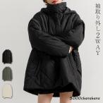 \10%OFFクーポン/「静かに暖めるベストフリース」キルティング ジャケット コート 3way 長袖 ロング丈 アウター 上着 レディース 中綿 キルト生地 ひょうたん フード付き ベストライナー 取り外し ノーカラー ポケット スリット 黒 白 秋冬
