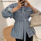 デニムジャケット レディース 長め 襟付き リボン 長袖 リボンベルト ベルテッド 大きめ ロング丈 ゆったり 大人 カジュアル きれいめ アウター 上着 Gジャン
