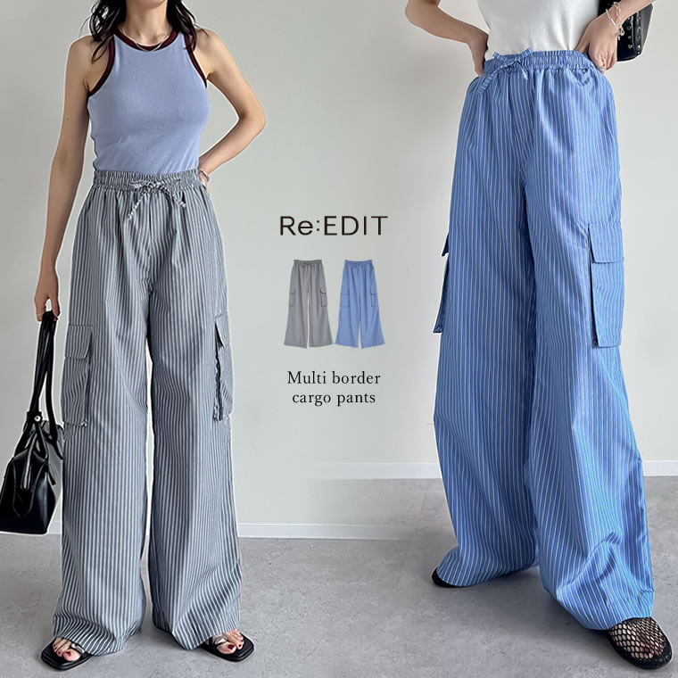 【限定!20%OFFクーポン×FAIRで3839円】SC-Lサイズ [低身長/高身長サイズ有]マルチストライプブロードカーゴパンツ レディース 春 夏 リエディ パンツ イージーパンツ ドロスト カーゴパンツ フルレングス ウエスト調整可能 セットアップ対応 [mb]