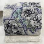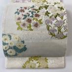 名古屋帯 逸品 証紙あり 本場結城紬地 井上商事 草花 霞 灰色 正絹 中古