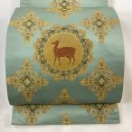 袋帯 美品 逸品 龍村晋 落款あり 鹿 華文 箔 灰緑 お太鼓柄 正絹 中古