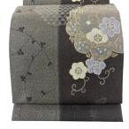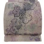 袋帯 逸品 洛陽織物 落款あり 紫根染 花唐草 銀糸 灰色 六通 正絹 中古