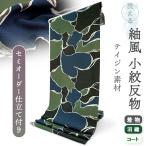 洗える着物 反物 小紋 紬風 レディース セミオーダー 仕立て付 緑 ブラック 猫 迷彩 袷 単衣 テイジン素材 NKF 和装